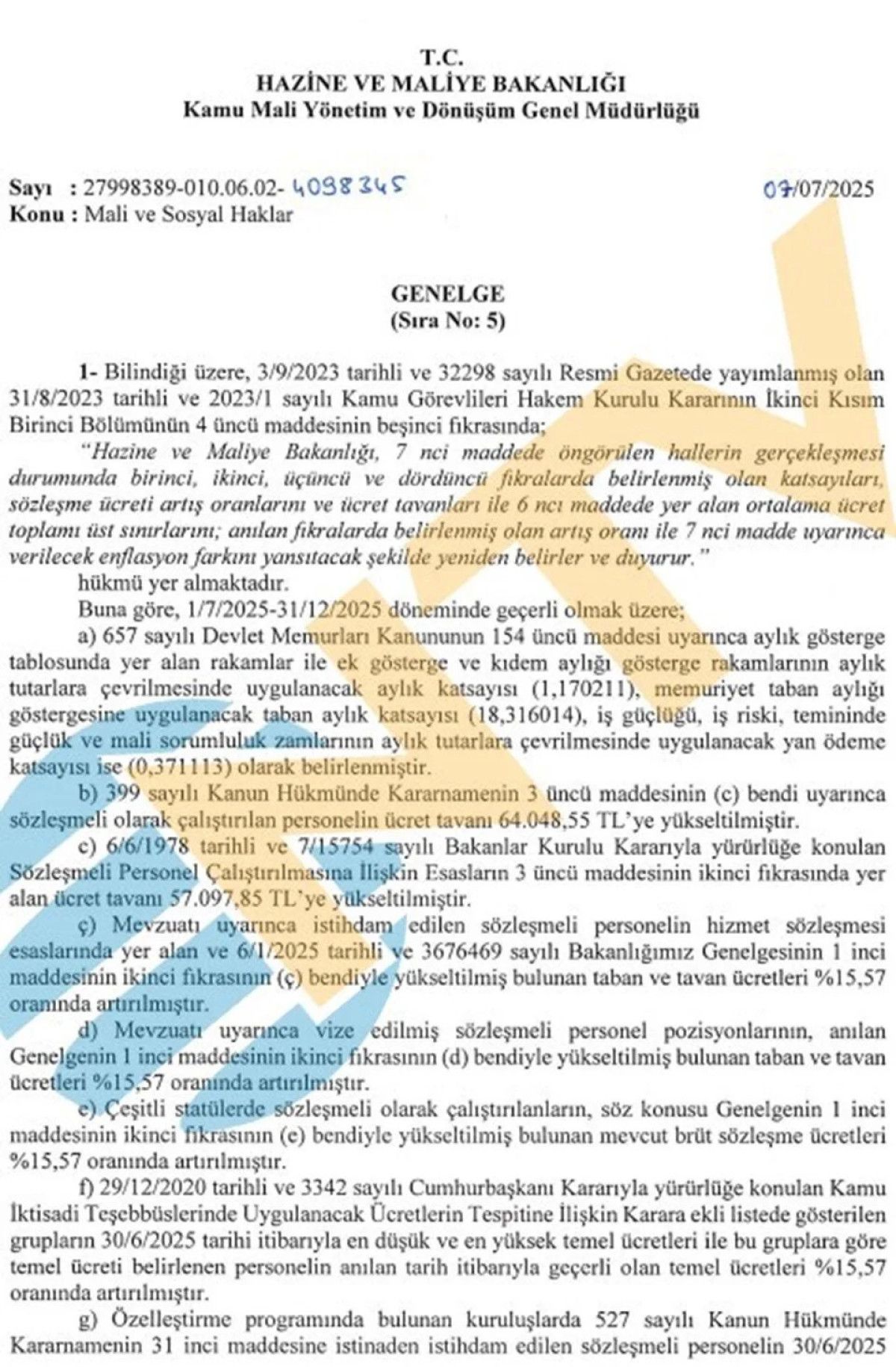 Ancak bu artışların resmileşmesi için Hazine ve Maliye Bakanlığı tarafından “Mali ve Sosyal Haklar” genelgesinin yayımlanması gerekiyordu.