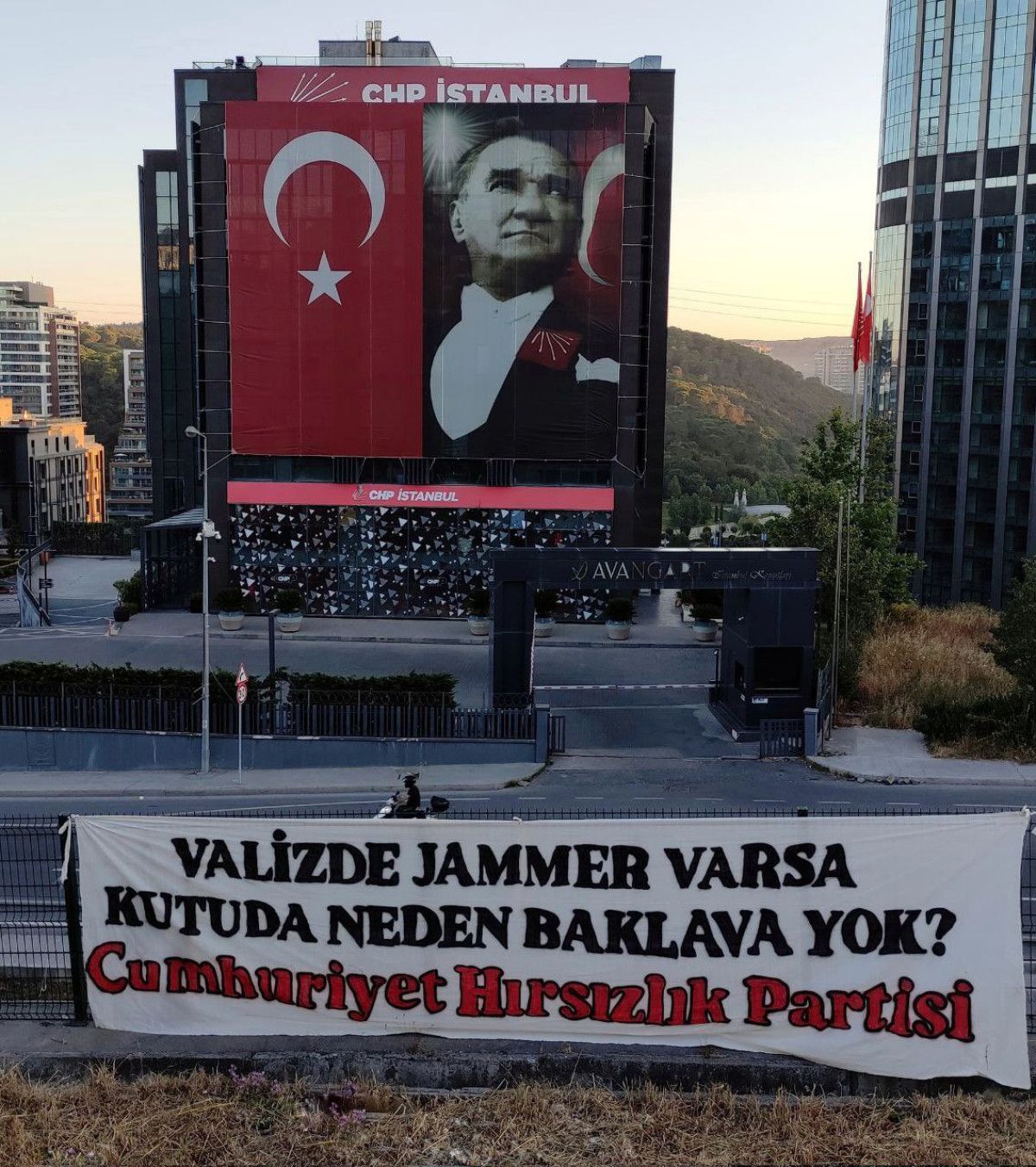 Pankartta, “Valizde jammer varsa kutuda neden baklava yok, Cumhuriyet Hırsızlık Partisi” ifadeleri yer aldı.