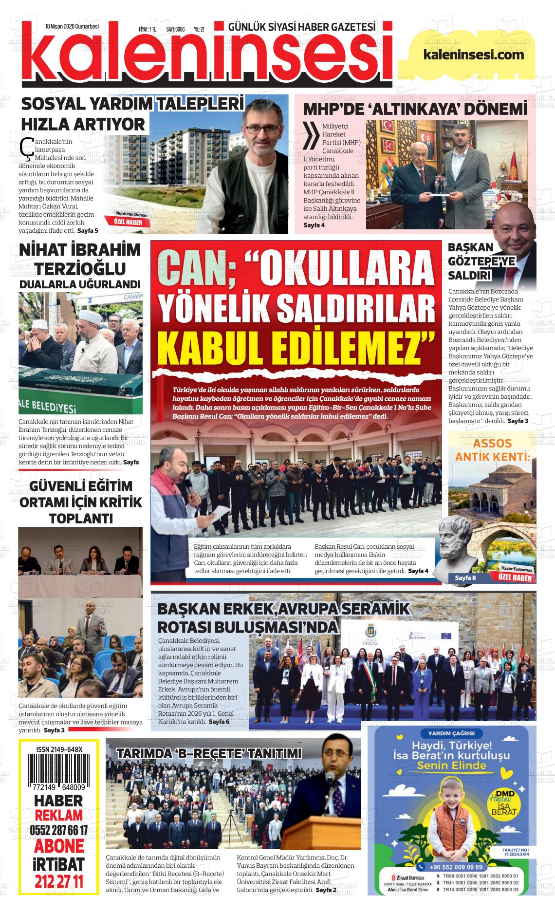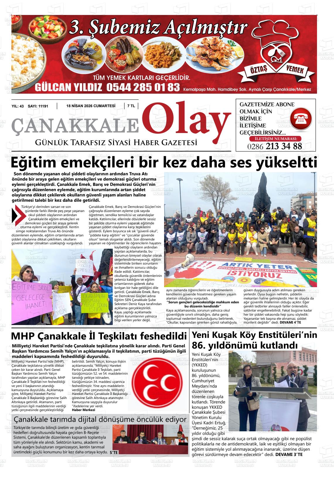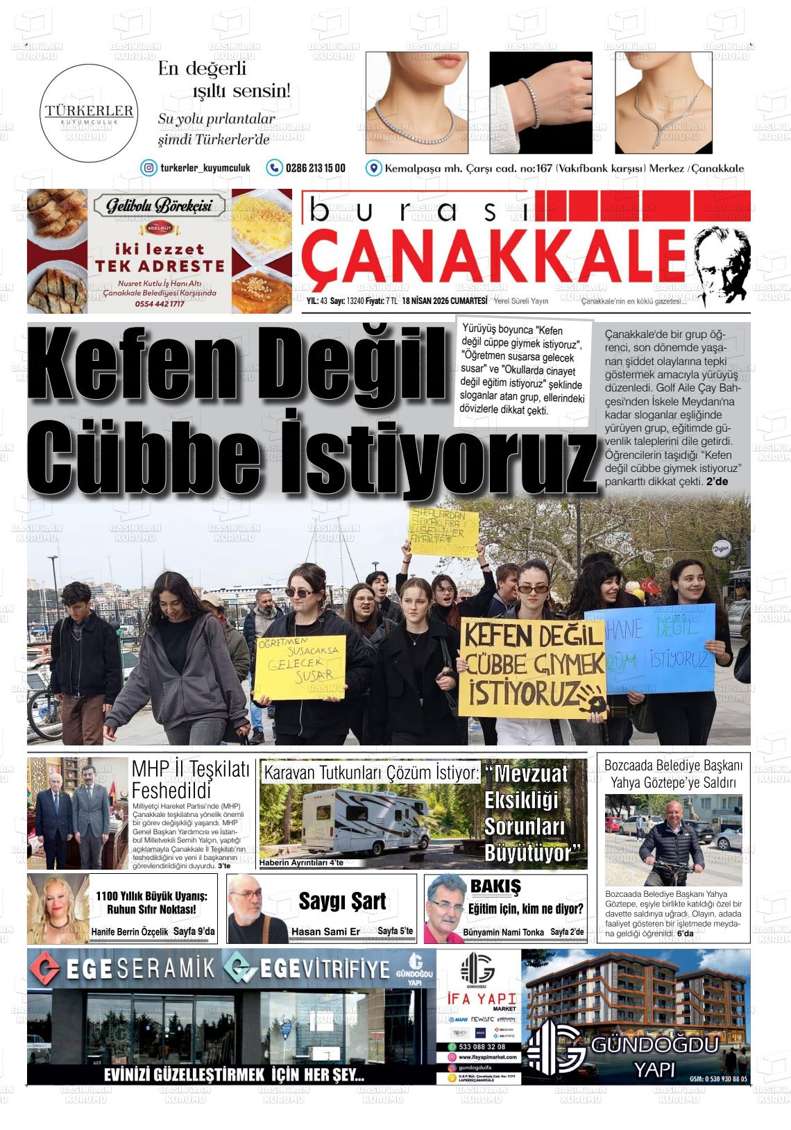 Çanakkale Yerel Gazeteleri 18 Nisan 2026, Cumartesi Günü Manşeti