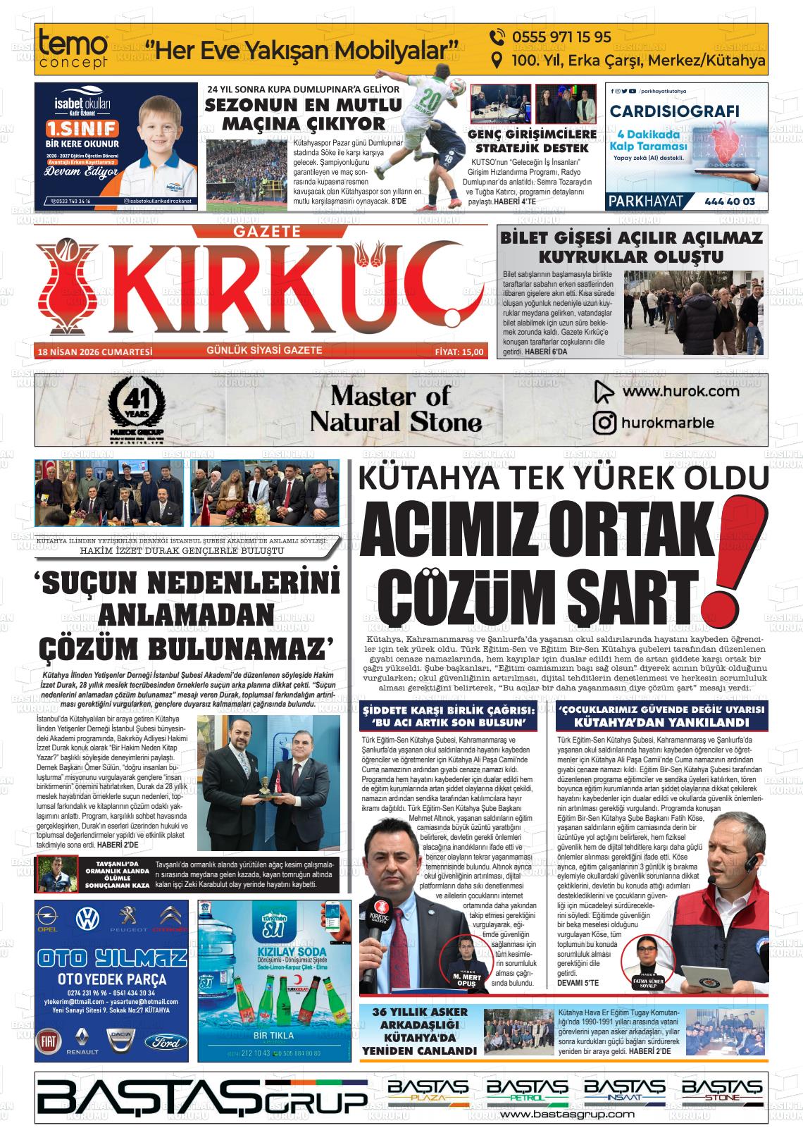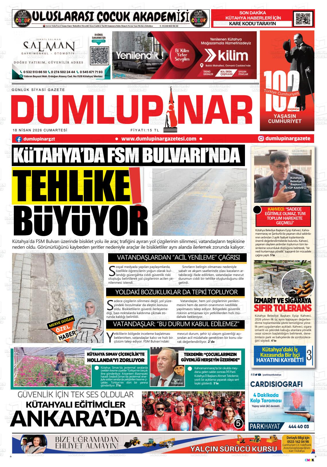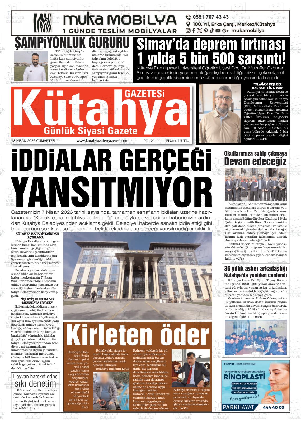 Kütahya Yerel Gazeteleri 18 Nisan 2026, Cumartesi Günü Manşeti