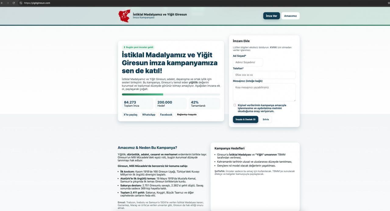 Kampanya, Giresun’a İstiklal Madalyası verilmesi ve “Yiğit” unvanının resmen tanınması için Türkiye Büyük Millet Meclisi’ne (TBMM) sunulacak. 31 Ekim 2025 saat 12:00’ye kadar 84 binden fazla kişi kampanyayı imzalarken, hedef 200 bin imza olarak belirlendi. Kampanyada Giresun’un, Kurtuluş Savaşı’nda verdiği mücadeleye dikkat çekildi.