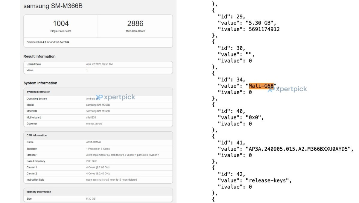 Galaxy M36, SM-M366B model numarasıyla Geekbench veri tabanında göründü. Akıllı telefon yapılan tek çekirdekli testlerden 1.004 ve çok çekirdekli testlerden ise 2 bin 886 puan almayı başardı. Bu sayede bazı özellikleri dolaylı yoldan da olsa belli oldu.