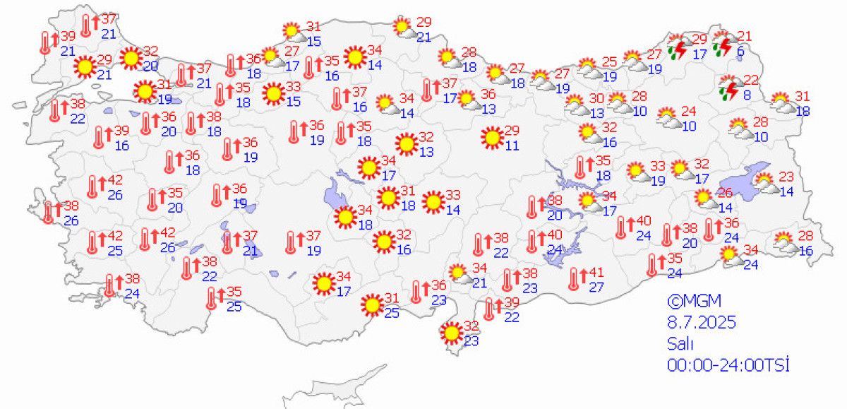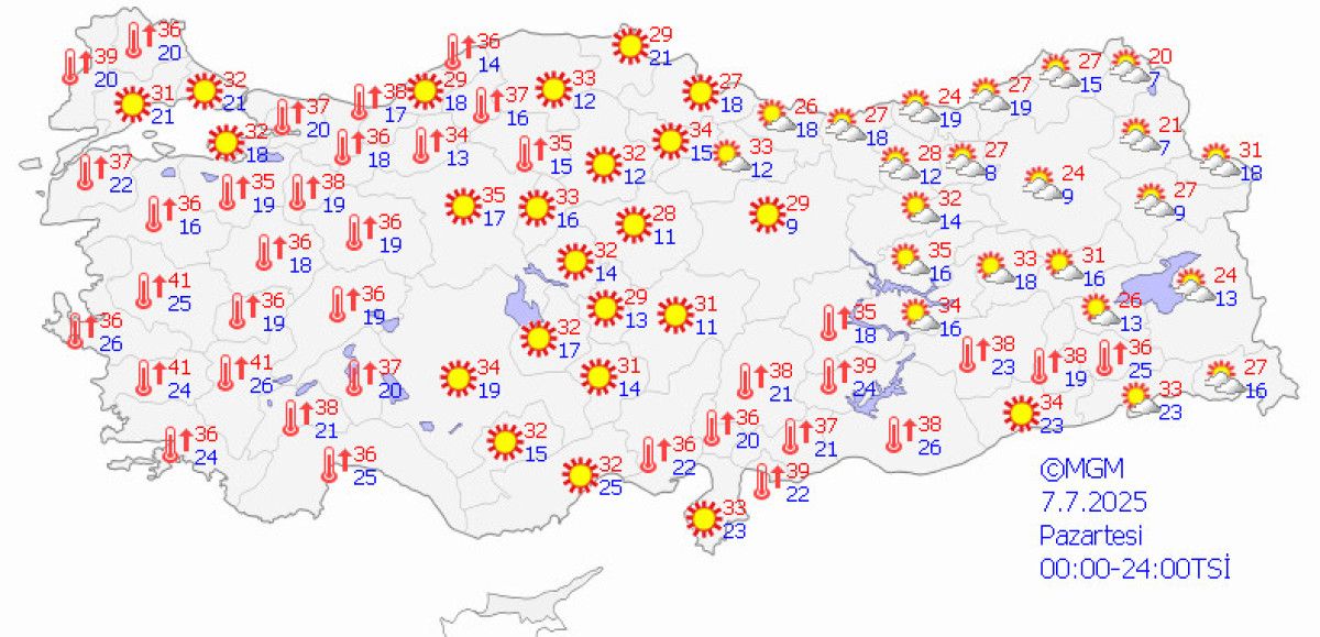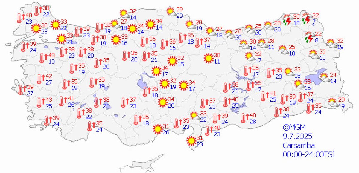Özellikle batı ve iç kesimlerde termometreler rekor seviyelere ulaşacak. Aydın’da 44 dereceye kadar çıkması beklenen sıcaklıklar; Edirne ve Muğla’da 40, Antalya’da 40, İzmir’de 39, Ankara ve Konya’da 36, İstanbul’da ise 34 dereceye ulaşacak.